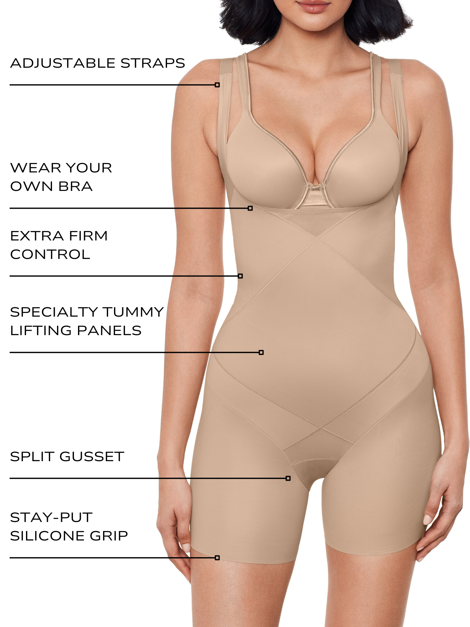 - Open-bust: Wear your own favorite bra for a customized fit without sacrificing the power of this shaper.